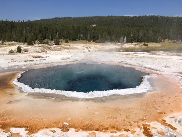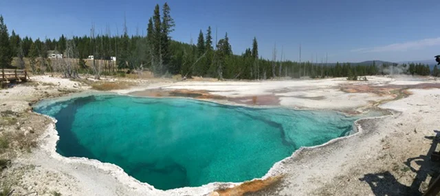 Grant Village campground is large, with 430 campsites, running water restrooms, and like all of the National Parks, pay to use showers. At this camp ground, the fee includes two showers a day which is a nice added bonus. It is in a beautiful setting with some sites on the lake, all with picnic tables and fire pits. It sits among lodge pole pine trees and there is space between campsites for some privacy giving things a nice feel. We spent the first two days exploring the northern areas in the park, both on the east and west side. Today, we will be exploring the southern areas of the park including the West Thumb Geyser Basin close to the campground and the areas around the Old Faithful Inn and the famous geyser.