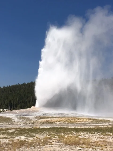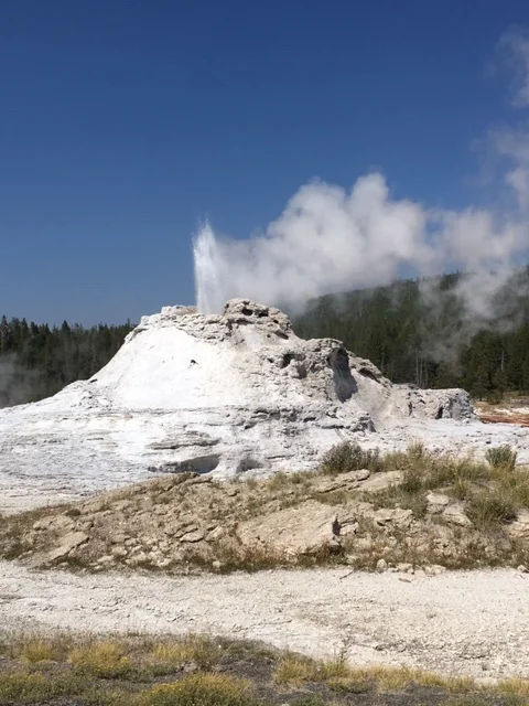 It started with a couple of small splashes of water and steam then with a whooshing sound the pressure built up and exploded upward to about 150 feet. The plume of boiling water and steam went straight up and only slightly did it fall away from the main source.
